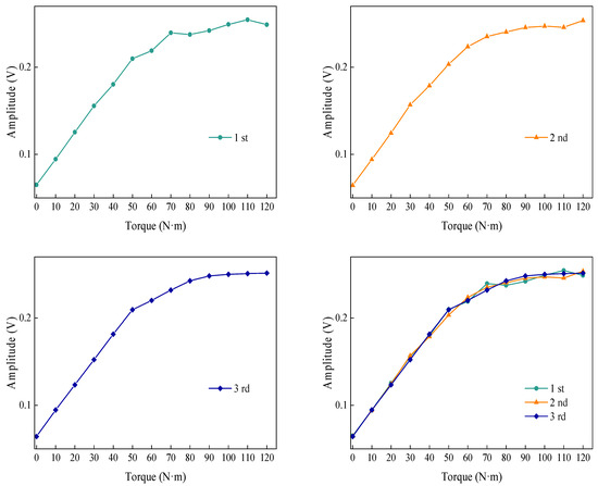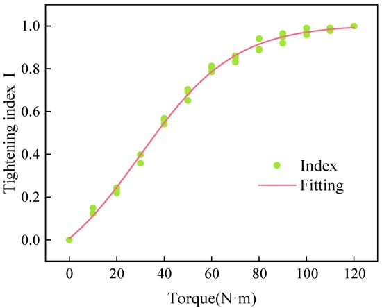 where represents the value in each set of focused signals, denotes the minimum value within each set, and corresponds to the maximum value. As shown in Figure 22, when the bolt preload reaches 80 N·m, the third experimental group exhibits the largest deviation (≈0.05 loosening index difference) from the normalized mean value, with a relative error of approximately 2% compared to the original focused signal average. These results confirm the measurement accuracy. Nonlinear curve fitting of the fastening indices from all three experimental groups is presented in Figure 23.