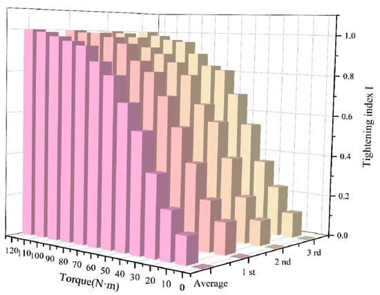 To further investigate the distribution characteristics of focused signal amplitudes under varying bolt preload conditions and enable accurate assessment of bolt loosening, a fastening index metric defined by Equation (9) was developed based on focused signal analysis. The derived relationship between the loosening index I and bolt preload levels is graphically presented in Figure 22.