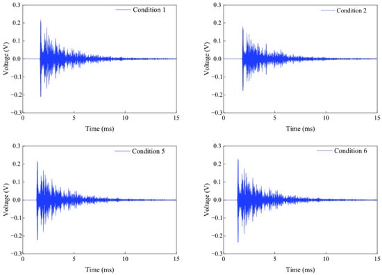 The excitation signal was set as a sine wave with a center frequency of 150 kHz and processed using a window function. The voltage amplitude was 5 V, with a loading duration of 3.5 ms. Smart washer A1 excited the signal while smart washer A2 received it, with the excitation repeated twice. Then, smart washer A2 was used to excite the signal while smart washer A1 received it, again repeating the excitation twice. The voltage output curve is shown in Figure 6. The time-history voltage curves from repeated experiments with smart washers A1 and A2 were similar, indicating that the performance of different smart washers as sensors or actuators was very consistent, confirming good stability.