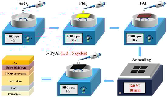 The fabrication process of 2D/3D perovskite films via multi-step spin-coating is illustrated in Figure 1. After spin-coating the perovskite film based on the two-step method, a low-concentration 3-PyAl solution (0.4 mg/mL in tert-amyl alcohol) was spin-coated onto the perovskite film for multiple cycles, and the 2D/3D perovskite film was prepared after annealing. Here, different spin-coating cycles (one cycle, three cycles, five cycles) and the traditional one-step spin-coating preparation process (4 mg/mL in isopropanol, one spin-coating) were used as comparisons to conduct a comparative study on the 2D/3D perovskite films and devices under different fabrication protocols.