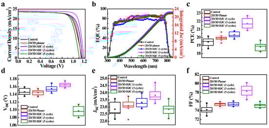 Figure 2a presents the current density–voltage (J–V) characteristics of champion PSCs fabricated under different conditions. Devices prepared via the multi-step spin-coating method are designated as 2D/3D heterojunction devices (2D/3D HJCs), while those fabricated using the conventional approach are termed 2D/3D planar devices. The champion device employing a three-cycle spin-coating strategy for 2D/3D HJCs demonstrates superior photovoltaic performance, achieving a remarkable power conversion efficiency (PCE) of 22.7% with an open-circuit voltage (Voc) of 1.175 V, short-circuit current density (Jsc) of 24.08 mA/cm2, and fill factor (FF) of 80.21%. Figure 2b displays the corresponding external quantum efficiency (EQE) spectrum, where the calibrated integrated current density shows less than 5% deviation from the Jsc value obtained through J–V measurements (the integrated current densities of control, 2D/3D planar, 2D/3D HJC (one cycle), 2D/3D HJC (three cycles), and 2D/3D HJC (five cycles) are 21.95 mA/cm2, 22.22 mA/cm2, 22.32 mA/cm2, 22.43 mA/cm2, and 21.76 mA/cm2, respectively). The average device performance exhibits a trend consistent with the champion devices (Figure 2c–f). The 2D/3D HJC device fabricated with three spin-coating cycles achieves the highest average power conversion efficiency (PCE) of 21.72%, while the control, 2D/3D planar, 2D/3D HJC (one cycle), and 2D/3D HJC (five cycles) devices deliver average PCE values of 19.44%, 19.93%, 20.32%, and 18.84%, respectively (additional performance metrics are provided in Table S1).