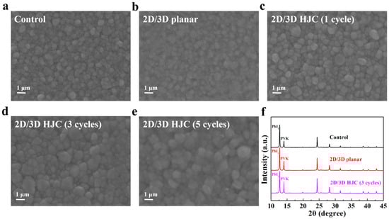 To elucidate the origin of performance variations among devices, we systematically characterized perovskite films fabricated using different processes. Figure 3a–f present scanning electron microscopy (SEM) images of perovskite films prepared under various conditions. The control perovskite film exhibits grain sizes of approximately 300–800 nm (Figure 3a). Upon forming the 2D/3D perovskite film via the conventional process, a modest increase in grain size (500–1000 nm) is observed (Figure 3b). However, conspicuous 2D perovskite coverage is simultaneously identified on the film surface (2D/3D planar film). While the crystalline quality of the perovskite is improved, the 2D perovskite capping layer typically exhibits moderate insulating properties and contains substantial defects. Consequently, it introduces new energy barriers that impede carrier transport. The 2D/3D perovskite films fabricated via the multi-step spin-coating process exhibit distinct surface morphologies. After a single coating cycle, the control perovskite grains undergo pronounced Ostwald ripening, with grain sizes growing to 600–1200 nm, while no significant surface coverage is observed (Figure 3c). Following three coating cycles, the grains further ripen to 800–1500 nm, yet still without discernible coverage formation (Figure 3d). After five cycles, grain growth ceases with no substantial size change, and a discernible 2D perovskite coverage begins to form on the surface (Figure 3e). These SEM observations demonstrate that sequential deposition of low-concentration 2D organic ammonium salt solutions facilitates the Ostwald ripening process of perovskite grains [20,21]. Crucially, during ripening, the 2D perovskite forms a heterojunction structure with the 3D phase. This unique architecture enhances hydrophobicity while avoiding the formation of an insulating capping layer, thereby maximally preserving the carrier transport advantages of 3D perovskite and improving charge extraction. However, as spin-coating cycles increase beyond the completion of Ostwald ripening, 2D perovskite coverage inevitably forms on the surface, necessitating strategic optimization of the coating cycle count. X-ray diffraction (XRD) analysis reveals a consistent trend (Figure 3f). After normalization, the perovskite peak intensity at 14° sequentially increases for the control, 2D/3D planar, and 2D/3D heterojunction (HJC) (three-cycle) films, indicating progressive grain growth and enhanced crystallinity. Collectively, these characterizations demonstrate that the 2D/3D HJC film possesses superior crystallinity and more favorable carrier transport properties [22,23,24,25].