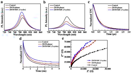 To validate the preceding conclusions, we characterized the carrier transport capabilities of the perovskite films fabricated through different processing routes. Figure 4a presents steady-state photoluminescence (PL) spectra, revealing that the 2D/3D HJC (three cycles) film exhibits the strongest PL intensity, followed by the 2D/3D planar and control films. This PL intensity hierarchy indicates a systematic reduction in defect density and carrier recombination rate, with the 2D/3D HJC (three-cycle) film showing the most efficient non-radiative recombination suppression. Although the 2D perovskite capping in the 2D/3D planar film provides some defect passivation, aggregation of insulating long-chain organics introduces new defects, resulting in higher defect density relative to the 2D/3D HJC (three cycles) film [26,27]. Conversely, Figure 4b displays PL spectra measured after depositing the hole transport layer (spiro-OMeTAD) atop the films. These results show an inverse trend, with the 2D/3D HJC (three-cycle) film showing the weakest PL intensity. This phenomenon stems from the synergistic effects of minimized interfacial defects, reduced energy barriers, and enhanced charge extraction efficiency within the 2D/3D HJC structure, leading to rapid fluorescence quenching [28,29]. Collectively, both PL measurements demonstrate that the multi-step spin-coated 2D/3D HJC architecture significantly improves carrier transport while suppressing recombination losses. Figure 4c,d present transient photocurrent (TPC) and transient photovoltage (TPV) decay measurements for devices fabricated with different perovskite films. In TPC tests, the transient current decay times progressively decrease for the control, 2D/3D planar, and 2D/3D HJC (three-cycle) devices, with values of 0.53 μs, 0.49 μs, and 0.42 μs, respectively. Conversely, TPV measurements show sequentially increasing voltage decay times of 0.75 ms, 0.89 ms, and 0.98 ms for the same device series. Shorter TPC decay times signify higher charge transport efficiency and faster extraction kinetics, while longer TPV decay times indicate suppressed carrier recombination losses and reduced interfacial defects [30,31]. These transient results align with the PL data, providing robust validation of our earlier conclusions. Furthermore, electrochemical impedance spectroscopy (EIS) measurements (Figure 4e) reveal that the 2D/3D HJC (three-cycle) device exhibits the largest recombination resistance arc radius, followed by the 2D/3D planar and control devices. This demonstrates sequentially decreasing recombination resistance across the series, implying progressively greater carrier recombination losses, consistent with all preceding characterization results [32,33,34].