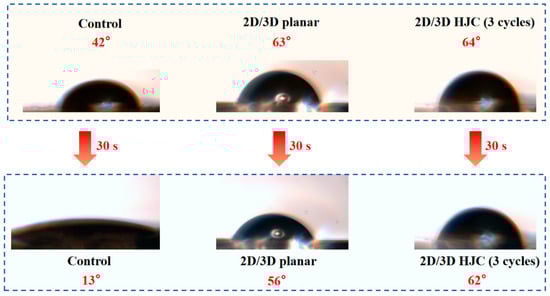 Finally, we characterized the stability of perovskite films and devices fabricated through different processing methods. Figure 5 presents the temporal evolution of water contact angles, revealing distinct moisture resistance characteristics among the films. The control film exhibits rapid hydrophilization, with its contact angle decreasing from 42° to 13° within 30 s, indicating complete water penetration and film degradation. In contrast, the 2D/3D planar film exhibits enhanced hydrophobicity with an initial contact angle of 63°, which decreases to 56° after 30 s, significantly outperforming the control film. Remarkably, the 2D/3D HJC film maintains exceptional hydrophobic stability, with contact angles decreasing only slightly from 64° to 62° within 30 s, confirming its superior moisture resistance. Corresponding device performance parameters show a clear correlation with film hydrophobicity (Figure S1). Under ambient conditions (45% RH), the control device retains only 33.5% of its initial efficiency after 800 h, while the 2D/3D planar device maintains 66.1%. Most notably, the 2D/3D HJC device demonstrates optimal stability, preserving over 85% of its original efficiency, which is a direct manifestation of its enhanced moisture resistance at the material level.