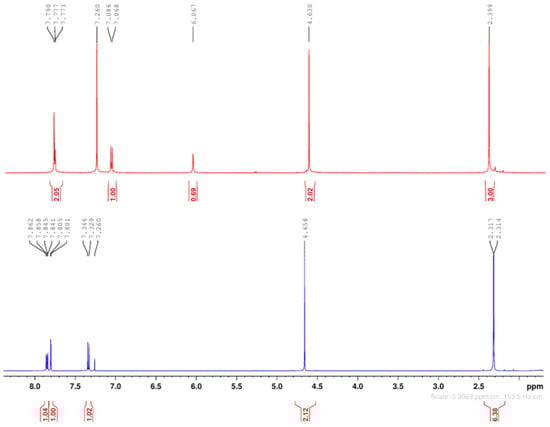 Superposed 1H-NMR spectra of 2-chloro-3′,4′-diacetoxy-acetophenone (down) and 2-chloro-3′-hydroxy-4′-acetoxy-acetophenone 3 (up).
