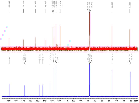 Superposed 13C-NMR spectra of 2-chloro-3′,4′-diacetoxy-acetophenone (down) and 2-chloro-3′-hydroxy-4′-acetoxy-acetophenone 3 (up).