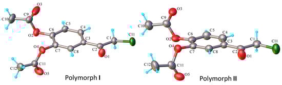 The results of the single crystal X-ray diffraction study for polymorphs I and II are illustrated in Figure 3, while the geometric parameters are summarized in Table S1 (see Supplementary Materials). According to X-ray crystallography, the reported structures represent two polymorphs of 2-chloro-3′,4′-diacetoxy-acetophenone. Polymorph I crystalizes in the monoclinic P21/c space group (ρcalcd = 1.411 g/cm3), while polymorph II crystalizes in the Sohnke P212121 space group of the orthorhombic system (ρcalcd = 1.406 g/cm3). In both structures, the asymmetric part of the unit cell comprises one molecule without interstitial solvate molecules.