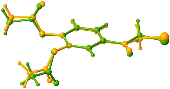 As can be seen from the overlay diagram presented in Figure 4, the conformation of the two molecules is very close except for the chloroacetyl fragments, which exhibit insignificant but opposite deviation from the mean plane of the aromatic ring. The acetoxy groups in both polymorphs, due to steric overcrowding, are almost perpendicular with respect to the aromatic rings. The values of the dihedral angles between the two planar fragments are in the range of 86.7(4) ÷ 89.2(2)° and 81.23(1) ÷ 89.22(1)° for I and II, respectively.
