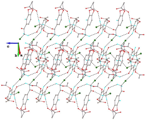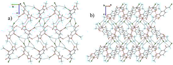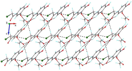 The monoacetoxy derivative 2-chloro-3′-hydroxy-4′-acetoxy-acetophenone 3 crystallizes in the monoclinic P21/c space group, with one molecule in the asymmetric unit. There are no interstitial solvent molecules in the crystal. The molecular structure of compound 3 is illustrated in Figure 10. As can be observed, the acetoxy group, due to steric overcrowding, is in nearly perpendicular orientation with respect to the main part of the molecule, which adopts essentially planar configuration. The absolute value of the C6-C7-O1-C9 torsion angle is 95.4(2)°. There are two contacts between the molecules in the adjacent stacks that are shorter than the sum of the van der Waals radii. In the absence of π-π stacking interactions, the crystal packing of compound 3 is mostly driven by the system of O-H···O and C-H···O contacts that are shorter than the sum of van der Waals radii, which organize the adjacent molecules into two-dimensional supramolecular layers in parallel arrangement to the 0 1 0 plane, as shown in Figure 11. The geometric parameters of the hydrogen bonds are listed in Table 3. The shortest contacts, C10-H10b···Cl1i (H···Cl1 = 3.110 Å, C···Cl = 3.647 Å, ∠CHCl = 116.9°, symmetry code (i) −x, y − 0.5, 1.5 − z) and Cl1···Cl1i (Cl···Cl = 3.737 Å, symmetry code (i) −x, 2 − y, 1 − z), between the molecules in the adjacent layers, which exceed the sum of van der Waals radii, indicate that the crystal structure is built from the parallel packing of the discrete 2D supramolecular network, as shown in Figure 12.