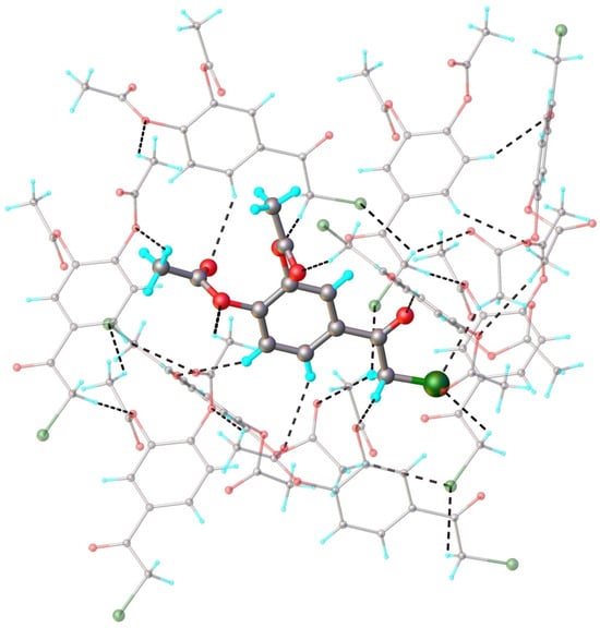 In order to reveal the structural distinctions of the two polymorphs, apart from the geometric characteristics of individual molecules, analyzing the supramolecular interactions in the crystal is also crucial. Therefore, the short intermolecular contacts in crystals I and II were thoroughly analyzed. Seeing that there are no conditions for classical hydrogen bonding, only C-H···O and C-H···Cl interactions are expected to determine the crystal packing motifs. The geometric parameters of the H-bonds are summarized in Table 3. It is noteworthy noting that no π-π stacking arrangements were revealed in the polymorph structures of I and II. This arises from the steric hindrance caused by the opposite orientation of two acetoxy groups relative to the aromatic ring.