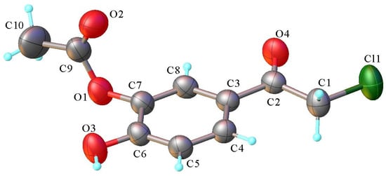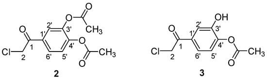 The X-ray spectral analysis of the monocrystal also proved the structure of the compounds: the two polymorphic structures of 2-chloro-3′,4′-diacetoxy-acetophenone 2 [polymorph I (with the m.p. = 103–104 °C) and polymorph II (with the m.p. = 132–133 °C)] and 2-chloro-3′-hydroxy-4′-acetoxy-acetophenone 3 (with the m.p. = 135–136 °C).