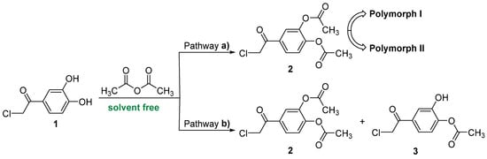 Reaction pathway between 2-chloro-3′,4′-dihydroxy-acetophenone and acetic anhydride under solvent-free conditions.