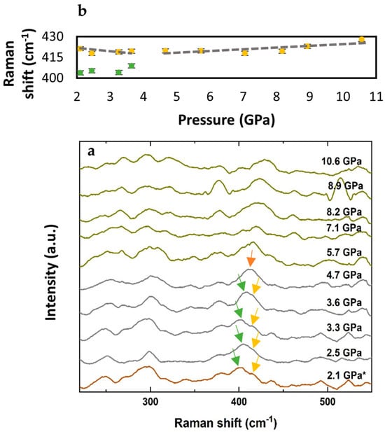 In α-FeOOH, modes near 410 cm−1 correspond to Fe–O–Fe/–OH stretching vibrations that are highly sensitive to changes in lattice symmetry [,,]. The previous high-pressure Raman studies have shown that spectral features near 410 cm−1 provide reliable markers for detecting phase transitions. This study builds on these insights by focusing on the pressure dependence of the 410 cm−1 mode as a key indicator of structural evolution under compression.