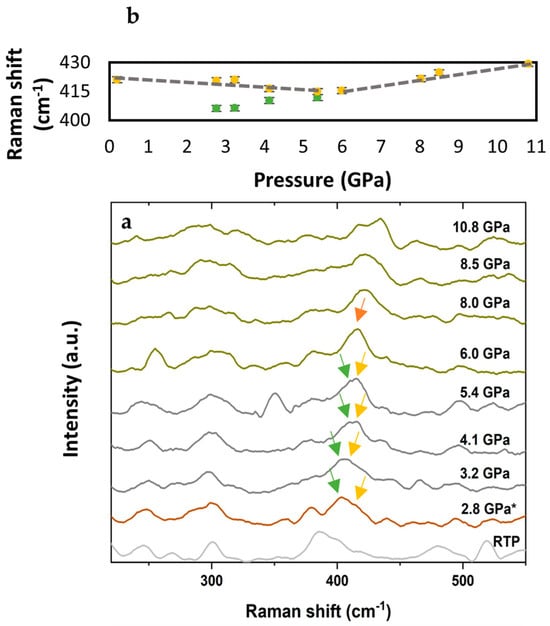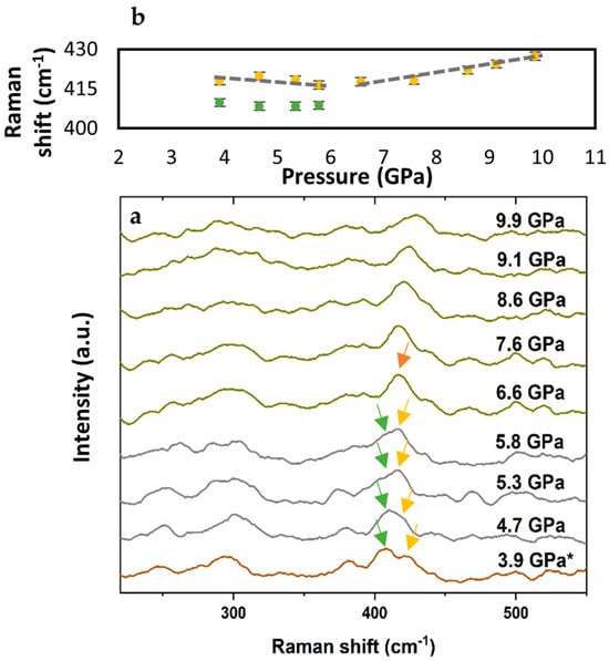 To verify data reliability, Raman measurements were independently repeated at 473 K and 523 K. In both cases, the pressure evolution of the 410 cm−1 modes was consistently reproduced. For clarity, only one dataset per temperature—selected based on higher signal-to-noise ratio and spectral completeness—is presented here. Although the 563 K experiment was not repeated due to technical constraints, the observed trend aligns with those at lower temperatures. On this basis, the key spectral features shown in Figure 3a, Figure 4a and Figure 5a are considered reliable and representative of the phase transition.