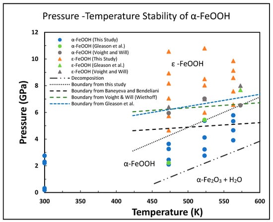 The α- to ε-FeOOH transition boundary has been a subject of considerable debate. Earlier work by Baneyeva and Bendeliani (1973) [] and Voigt and Will (1981) [] reported nearly parallel linear boundaries, though the latter is offset by approximately 1.5 GPa (Figure 6). In contrast, Wiethoff et al. (2017) [], based on in situ XRD data, suggested a nearly pressure-independent boundary. The boundary derived in the present study falls between those reported by Baneyeva and Bendeliani (1973) [] and Voigt and Will (1981) [] within the studied P-T range, but with a steeper slope. The experiments reported by Gleason et al. (2008) [] are less constrained on the phase boundary. Their data, nevertheless, are in good agreement with the present results, although the boundary they proposed by combining their data with those reported by Voigt and Will [] has a less steep slope than the present work.