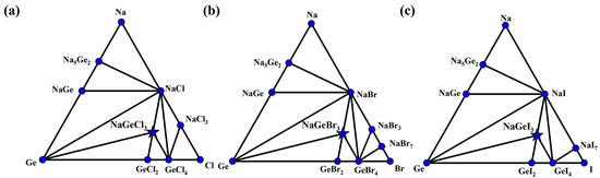 Based on the data from the Open Quantum Materials Database (OQMD) [42] and our DFT calculation results, the ternary phase diagrams of Na-Ge-X at 0 K were constructed, as shown in Figure 2a–c. Herein, only thermodynamically stable compounds are displayed. It can be seen from the Na-Ge-X ternary phase diagrams that the direct decomposition products of NaGeX3 compounds are NaX and GeX2. Therefore, for the calculation of the decomposition energy of NaGeX3, we only consider the phase equilibrium reaction according to Equation (3):