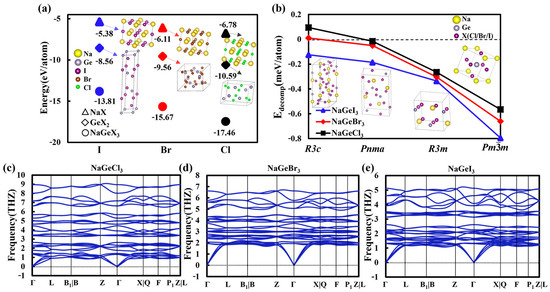 (a) The corresponding decomposition products of R3c NaGeX3 (X = Cl, Br, I), (b) decompound energies of NaGeX3 (X = Cl, Br, I) with different phases, (c–e) the phonon spectra of NaGeX3 (X = Cl, Br, I) with R3c space group.