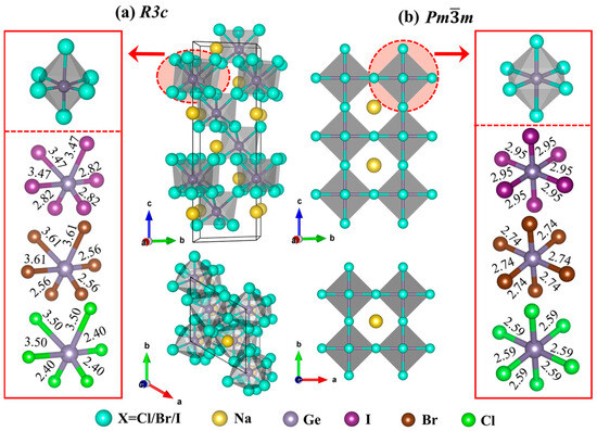 The relaxed structure and the Ge-X (X = Cl, Br, I) bond lengths in the [GeX6] octahedron of NaGeX3 with (a) R3c and (b) Pmm phase using DS-PAW.