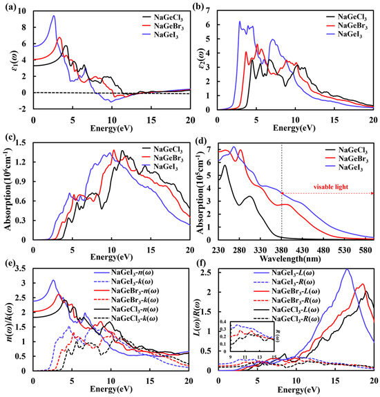 (a,b) Dielectric function; (c,d) Absorption coefficient; (e) Refractive index n(ω) and Extinction coefficient k(ω); (f) Reflection spectrum R(ω) and Loss function L(ω) for NaGeX3 (X = Cl, Br, I).