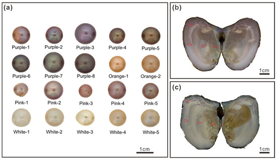 (a) Edison pearls (n = 20) showing four color variants. (b) Representative purple Hyriopsis cumingii specimen. (c) Representative white Hyriopsis cumingii specimen. The red circles and numbers represent the selected points and numbers for the LA-ICP-MS analysis.