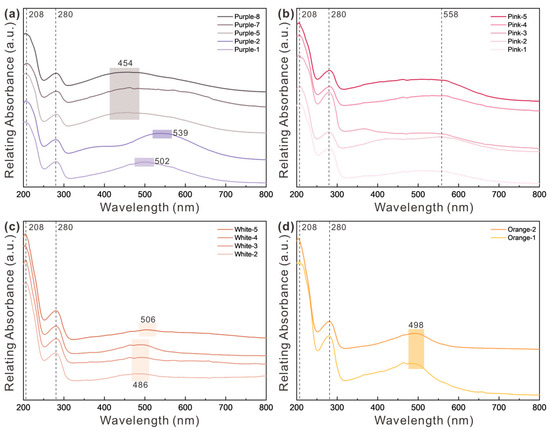 Surface analysis was conducted at multiple points on the nacreous layer of 20 freshwater nucleated cultured pearls, with representative data presented. UV-vis spectroscopy revealed consistent characteristic absorption bands centered near 205 nm and 280 nm across all samples. Additionally, broad absorption features between 450 and 580 nm exhibited color-dependent spectral variations among the pearl samples (Figure 2a–d).