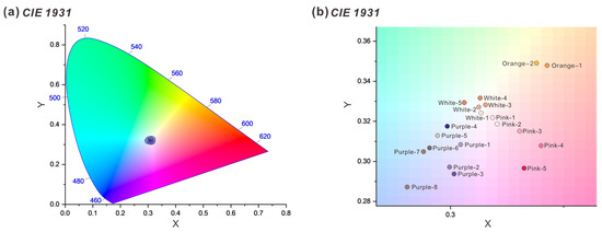 CIE 1931 chromaticity coordinates calculated from the reflection spectra of Edison pearl films [19]. (a) Full CIE 1931 chromaticity diagram. (b) Zoomed-in CIE 1931 chromaticity diagram.