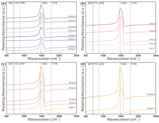 Surface analysis was conducted at multiple points on the nacreous layer of 20 freshwater nucleated cultured pearls. All colored pearls exhibited consistent absorption peaks at 697 cm−1, 710 cm−1, 878 cm−1, 1483 cm−1, 1779 cm−1 and 2353 cm−1 (Figure 4a–d). FTIR spectral peak assignments were made by referencing standard material spectra and prior research [12,20]. The observed peaks at 697 cm−1 and 710 cm−1 correspond to the in-plane bending vibration (υ4) of aragonite’s O-C-O groups, while the 878 cm−1 peak represents the out-of-plane bending vibration (υ2) of aragonite O-C-O. The intense 1483 cm−1 peak is characteristic of the asymmetric stretching vibration in calcite’s [CO3]2− ions, and the weak 1779 cm−1 feature arises from overtone and combination bands (υ1 + υ4) of fundamental vibrations.