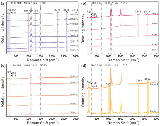 The white pearls exhibit relatively weak organic absorption peaks at 1135 cm−1 and 1525 cm−1 (Figure 5c). In contrast, colored pearls show stronger and more numerous organic absorption peaks. The Raman spectra of pearls with varying color saturation within the same hue were spectrally analogous, with peak intensities increasing proportionally to color depth. Strong absorption bands from polyene-related compounds appeared in the 1000–1600 cm−1 region. The peaks at 1125 cm−1 and 1135 cm−1 correspond to C-C (ν2) stretching vibrations, while the characteristic peaks at 1509 cm−1, 1515 cm−1 and 1525 cm−1 represent C=C (ν1) stretching vibrations of the polyene backbone. Both ν1 and ν2 peak intensities increased with darker body colors (Figure 5a,b,d), with their specific positions correlating with polyene chain length [6,21]. Purple pearls additionally display an absorption peak near 1297 cm−1, attributed to in-plane C-H bending vibrations.