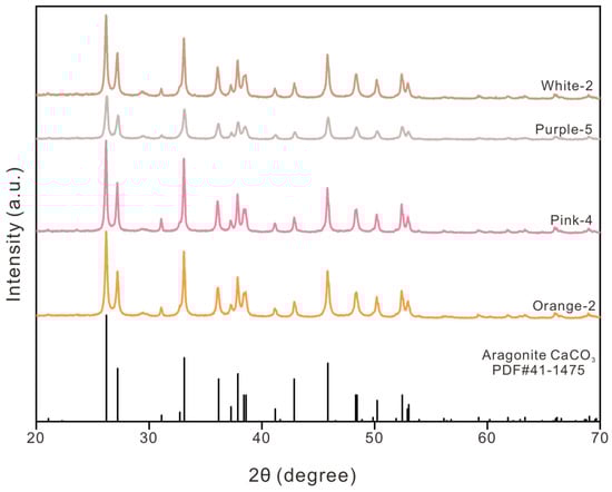 X-ray diffraction analysis was performed on powdered nacreous layers from pearls of different body colors. The diffraction patterns showed consistent peak positions and splitting characteristics across all colored samples (Figure 6). All samples exhibited diffraction patterns matching standard aragonite (PDF# 41-1475). No diffraction peaks corresponding to vaterite or other calcium carbonate polymorphs were detected. These results indicate that the nacreous layers of the examined freshwater cultured pearls consist exclusively of aragonite, with no detectable secondary crystalline phases present.
