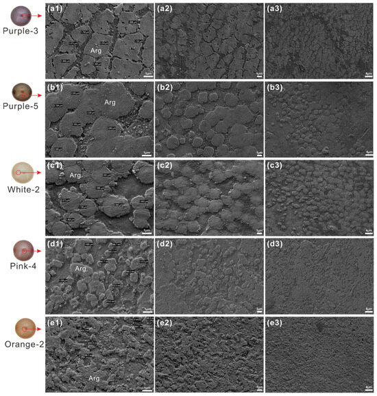 Backscattered electron (BSE) images showing the aragonite (Arg) tablet arrangement on pearl surfaces. From left to right in each row: 10,000×, 5000× and 2000× magnification. (a1–a3) Purple pearls exhibit uniformly aligned lamellar tablets in compact arrays. (b1–b3) Gray-purple pearls with a heterogeneous circular tablet distribution. (c1–c3) White pearls with near-circular tablets. (d1–d3) Pink pearls with tightly packed irregular polygonal tablets. (e1–e3) Orange pearls with rounded polygonal tablets.
