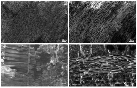 Fracture surface analysis further confirmed the aragonitic nature of pearl nacre. Cross-sectional SEM images revealed vertically aligned columnar tablets (Figure 8), demonstrating the classic tablet microstructure of aragonitic nacre: compact inter-tablet bonding without spherical or granular morphologies. The absence of spherulitic structures (characteristic of vaterite) and the consistent columnar architecture provide conclusive evidence that the pearl layers are exclusively composed of aragonite.