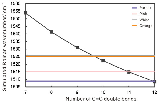 Correlation between the count of C=C double bonds and the Raman band position of C=C stretching vibration (ν1; mean value derived from empirical formula) [23]. The black lines indicate the Raman shift values associated with polyenes containing varying numbers of C=C double bonds.