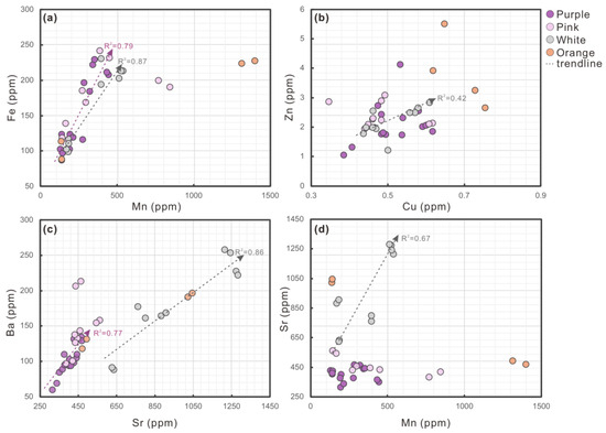 Trace elements of the freshwater nucleated cultured pearl surface. (a) Mn vs. Fe. (b) Cu vs. Zn. (c) Sr vs. Ba. (d) Mn vs. Sr.