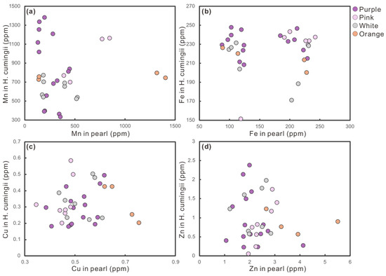 Previous studies proposed potential host mussel regulation of pearl coloration [15,30,49]. To test this hypothesis, we conducted a comparative analysis of trace element compositions in Hyriopsis cumingii peals and their corresponding mantle tissues. The results demonstrate no statistically significant correlation between the metallic elements in pearls and mantle tissues (Figure 11), effectively ruling out a regulatory role of the mother mussel in pearl coloration. Four key chromogenic elements, Mn, Fe, Cu, and Zn, were analyzed for their chromatic contributions (Figure 11a–d). These elements show no correspondence between pearl color and natal position within the host mussels (Figure 1). Collectively, these findings indicate that Hyriopsis cumingii does not play a decisive role in pearl coloration, demonstrating that pearl color develops independently of host mussel characteristics.