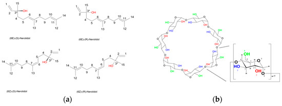 (a) The four possible stereoisomers of nerolidol are shown, each differing in the configuration at C3 (chiral center) and at the C6–C7 double bond. Top left: (6E)-(S)-Nerolidol; top right: (6E)-(R)-Nerolidol; bottom left: (6Z)-(S)-Nerolidol; bottom right: (6Z)-(R)-Nerolidol. (b) The molecular structure of β-cyclodextrin, composed of seven α-D-glucopyranose units linked by α-1,4-glycosidic bonds, is shown. Hydroxyl groups at the C2 and C3 positions (secondary rim) and the C6 position (primary rim) are indicated in red, blue, and green, respectively. A single glucopyranose unit is enlarged and annotated with atom numbering for clarity.
