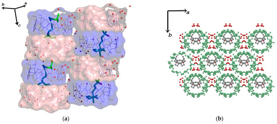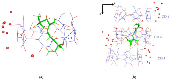 Water molecules bridge neighboring inclusion complexes by forming hydrogen bonds with oxygen atoms of adjacent cyclodextrins (Figure 2b). Main intra- and intermolecular interactions between the host, guest, and water molecules are quoted in Supplementary Table S1.
