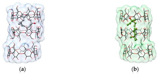 In all cases, the guest adjusted to achieve a better fit within the head-to-head CD dimer, and the resulting 2:1 complex remained stable throughout the simulations. Within the hydrophobic cavity of the cyclodextrins, the guest molecule, regardless of isomeric form, consistently adopted an extended conformation to maximize the surface area available for hydrophobic intermolecular interactions. The computed binding affinities for all complexes differed by less than the estimated MM/GBSA uncertainty, indicating no statistically significant preference, though a slight trend toward c8-REL was observed. This discrepancy underscores an important remark: while computational approaches used in this work—molecular docking, molecular dynamics, and MM/GBSA—capture general binding modes and stability in a solution, they do not yet reliably predict stereoisomeric selectivity during crystallization. Recognizing and analyzing such mismatches are essential for improving the accuracy of predictive models of host–guest selectivity, which in turn will advance the rational design of separation strategies and selective inclusion complexes in pharmaceutical, agrochemical, and flavor/fragrance applications.