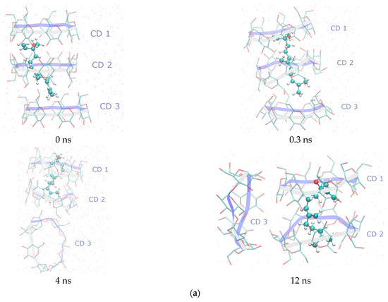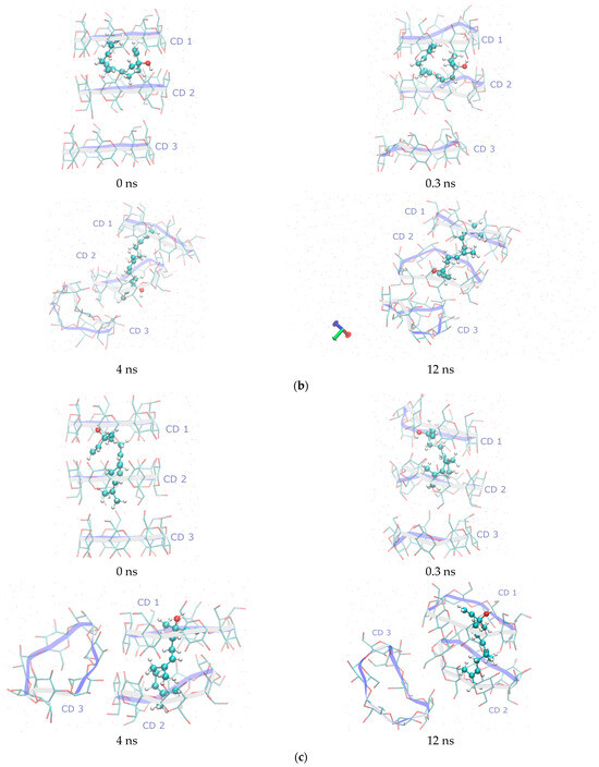 Representative snapshots from MD simulations of the (a) t-REL/β-CD IC, (b) c1-REL/β-CD IC, and (c) c8-REL/β-CD IC taken at key timepoints (0, 0.3, 4, and 12 ns) to illustrate structural evolution and dynamic behavior in an aqueous solution. The selected timepoints highlight major conformational events and guest encapsulation states. All simulations were performed in explicit water at 300 K. Guest molecules are represented using the CPK coloring scheme, while the β-CD host macrocycles are depicted using a “twister” cartoon style. All molecular visualizations were generated using the VMD v1.9.3 software.