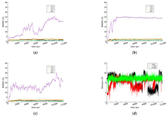 The RMSD plots are indicative of this dynamic behavior. In the first case, the initial shifting of REL into the CD dimeric cavity is evident by the abrupt rise in the value of the guest (blue line). A gradually rise in the value is observed until the stabilization of the guest occurs at a distance of 20–25 Å away from its initial site (Figure 6a). In the second case, the guest rapidly departs away from its initial position, and it has also been stabilized in the CD dimeric cavity, with a stable RMSD value of 20–25 Å (Figure 6b). Finally, the RMSD value of the c8-REL guest, which adopts an extended conformation, seems to fluctuate around 15 Å and finally stabilizes at 20 Å (Figure 6c). The RMSF and B-factor values of the guests are shown in Supplementary Table S3. From these values, it is evident that the crystallographic determined position of the t-REL is not comfortable as the guest struggles to find a better fitting inside the dimeric CD cavity.