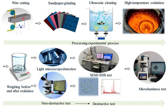 The cross-sectional microstructures were then observed using scanning electron microscopy (SEM), and elemental distribution from the surface to the substrate was analyzed via energy-dispersive spectroscopy (EDS). Microhardness measurements were conducted using a Vickers hardness tester to assess the changes in mechanical properties and the characteristics of the oxidation products at different temperatures. Additionally, X-ray photoelectron spectroscopy (XPS) was employed to detect and analyze the elemental composition and chemical states of Ti, Al, O, and C on the oxidized surfaces. The entire experimental testing process is shown in Figure 1.