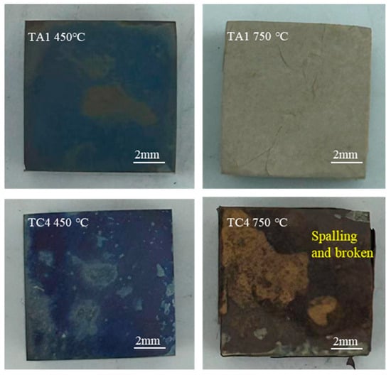 (1) At 450 °C, both TA1 and TC4 alloys exhibit minimal oxidation weight gain, with only slight changes in surface morphology and negligible spallation. Apart from color changes in the oxide film, the surface remains largely intact. In contrast, at 750 °C, both alloys show significant mass gain accompanied by more pronounced surface corrosion and oxide layer detachment.