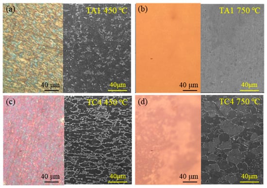 Figure 3 presents the microstructural morphology of the oxidized samples after 50 h of high-temperature exposure, captured using optical microscopy and scanning electron microscopy (SEM). As shown in Figure 3a, the oxide layer formed on TA1 at 450 °C consists primarily of yellow, gray, and blue hues, with a relatively loose structure. In contrast, Figure 3b reveals that at 750 °C, TA1 develops a highly porous oxide layer. Additionally, after oxidation at 450 °C, the TA1 surface exhibits numerous fine particles, whereas at 750 °C, the microstructure transitions to include some elongated or strip-like features. For TC4, as shown in Figure 3c, the oxide layer formed at 450 °C appears denser, with dominant gray-blue and purple-blue coloration. At 750 °C (Figure 3d), TC4 develops a compact yellowish-brown oxide film. Notably, a significant increase in grain size is observed in the TC4 alloy after 50 h of exposure at 750 °C, compared to that at 450 °C.