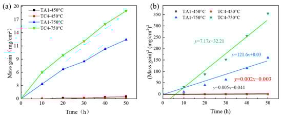 (a) Mass gain, and (b) square of mass gain of TA1 and TC4 alloy high-temperature oxidation at 450 °C and 750 °C.