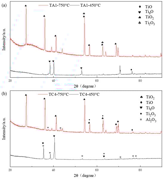XRD patterns of different titanium alloys at various temperatures after 50 h, (a) TA1 at 450 °C and 750 °C; (b) TC4 at 450 °C and 750 °C.