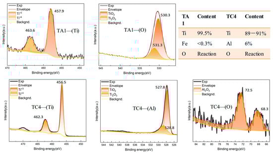 For the TC4 alloy oxidized at 750 °C, the binding energies of Ti4+ and Ti3+ were measured at 456.5 eV and 462.3 eV, respectively. Similarly to TA1, the primary oxidation products were identified as TiO2 and Ti2O3 [11]. In addition to titanium oxides, the presence of Al3+ was also detected, originating from the oxidation of aluminum in the TC4 alloy to form Al2O3. The Al3+ peaks were observed at binding energies of 68.3 eV and 72.5 eV, consistent with the formation of alumina [12]. These findings indicate that at 750 °C, both TA1 and TC4 primarily form TiO2 and Ti2O3 on their surfaces, with TiO2 being the dominant oxide species. However, due to the presence of aluminum in TC4, Al2O3 is additionally formed, distinguishing its oxidation behavior from that of commercially pure TA1.