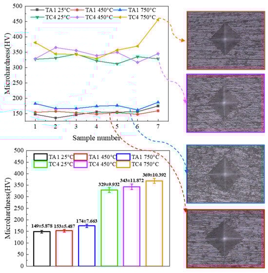 A more detailed analysis of the microhardness profiles reveals that, overall, the hardness variation across each sample was relatively uniform. However, regions closer to the oxidized surface exhibited slightly elevated hardness values, likely due to the higher concentration of oxidation products in these areas [13]. After 50 h of oxidation at 450 °C, the TA1 alloy showed a microhardness of approximately 174 ± 7.66 HV, representing a 13.27% increase compared to its baseline hardness at the same temperature (153 ± 5.49 HV). For the TC4 alloy, the microhardness increased from 343 ± 11.87 HV after oxidation at 450 °C to 369 ± 10.39 HV after oxidation at 750 °C, indicating a significant enhancement in surface hardness. This increase in hardness at elevated temperatures is primarily attributed to the formation of thicker and more pronounced oxide layers. Although the oxide scale formed at 750 °C is more prone to spallation, the near-surface region retains a higher oxide content compared to that formed at 450 °C. Given that oxides such as TiO2 and Al2O3 possess inherently high hardness, their accumulation near the surface substantially contributes to the observed increase in microhardness.
