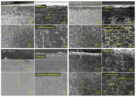 Figure 8 presents the microstructural features of TA1 and TC4 alloys after 50 h of thermal exposure at 450 °C and 750 °C, observed both near the surface and deeper into the substrate. For TA1 oxidized at 450 °C, the microstructure predominantly comprises a small quantity of primary α-phase and fine secondary α laths. Due to relatively slow air cooling, α-phase nucleation initiates at grain boundaries and subsequently grows inward along the β-phase boundaries, forming elongated and aligned α structures, commonly referred to as “α colonies.” At 750 °C, although the temperature approaches the α-to-β transformation point (approximately 882.5 °C), the transformation is not fully activated. Consequently, the microstructure remains primarily composed of equiaxed α-phase with a small fraction of intergranular β-phase.