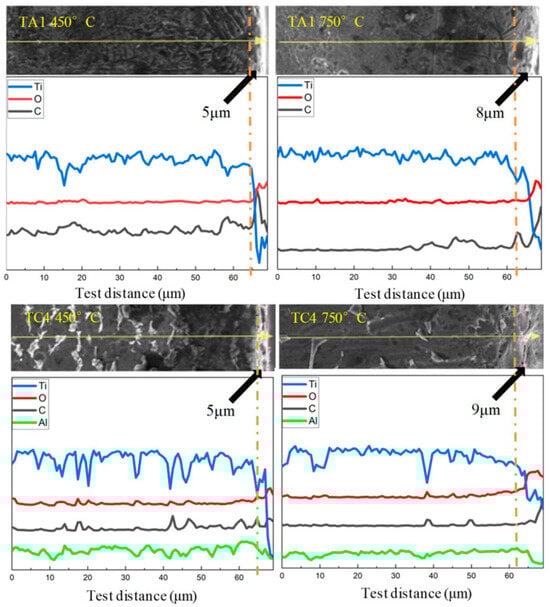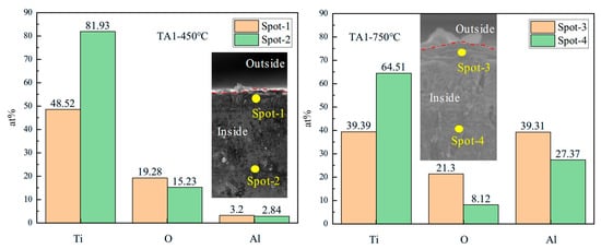 Figure 9 presents the results of point-by-point elemental analysis conducted on the surface of the TA1 alloy after 50 h of thermal oxidation at 450 °C and 750 °C. In both cases, the oxygen concentration was found to be highest near the oxidized surface. Specifically, for TA1 oxidized at 450 °C, the oxygen content near the surface reached approximately 19.28%, while at 750 °C, it increased to around 21.30%. This comparison indicates that higher oxidation temperatures result in slightly greater oxygen enrichment at the surface. Moreover, a clear gradient is observed in oxygen content: as the measurement points move deeper into the material—away from the oxidized surface—the oxygen concentration decreases. This trend confirms that oxygen diffusion is more pronounced at elevated temperatures and that oxidation primarily occurs near the surface, with limited penetration into the interior. A similar trend is observed for carbon (C) content, which also increases both with rising temperature and proximity to the oxidized surface. This suggests that, alongside oxygen, carbon may also accumulate near the surface during high-temperature exposure, potentially due to atmospheric contamination or decomposition of organic residues during heating.