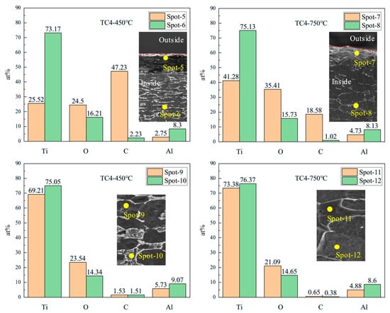 Figure 10 presents the results of point-by-point elemental analysis conducted on the surface of the TC4 alloy after 50 h of thermal oxidation at 450 °C and 750 °C. Similarly to the observations for TA1, the oxidation of TC4 is more pronounced near the oxidized surface, and the degree of oxidation intensifies with increasing temperature. However, a notable difference is observed when comparing elemental distribution across the α and β phases. At both 450 °C and 750 °C, the oxygen content within the β phase is consistently higher than that in the α phase. This suggests that the β phase is more susceptible to oxygen diffusion and oxidation under high-temperature conditions. The greater affinity of the β phase for oxygen may be attributed to differences in crystal structure or the localized distribution of alloying elements such as vanadium, which may influence oxidation behavior. These findings indicate that, within the TC4 microstructure, the β phase plays a more active role in oxidation processes, especially at elevated temperatures.