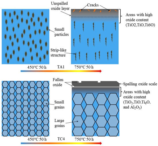 The differences in oxidation behavior and microstructural evolution of the two titanium alloys under high-temperature conditions are illustrated in Figure 12. By integrating the XRD results (Figure 5) with XPS analysis (Figure 6) of titanium oxidation states, the presence of both Ti3+ and Ti4+ species on the oxidized surfaces was confirmed, indicating the formation of Ti2O3 and TiO2 phases. However, due to the predominance of TiO2, the characteristic peaks associated with TiO are relatively weak, and the peak corresponding to Ti2O3—typically associated with a blue coloration—is not clearly observed.